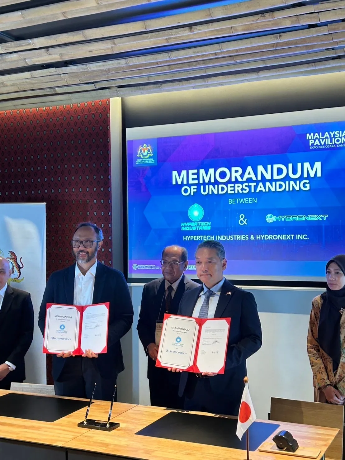 MOUの締結式は、Expo2025のマレーシアパビリオン内で行われ、マレーシア科学技術イノベーション省(MOSTI)の事務局長、Datuk Seri Hj. Hasnol Zam Zam bin Hj. Ahmad氏が出席。ハイドロネクストのCEO、永井正章氏と、NanoMalaysia BerhadのCEO兼Hypertech Industriesの取締役、Dr. Rezal Khairi Ahmad氏が合意書に署名しました。この式典は現地メディアでも報道され、注目を集めました。