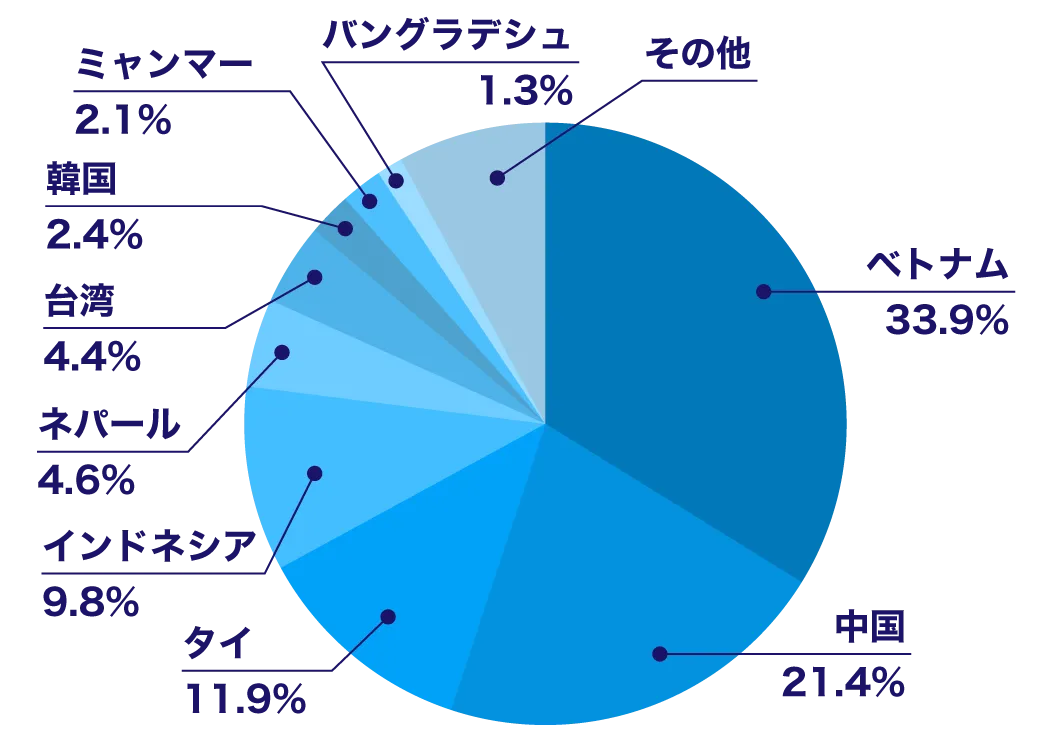 - - 技術・人文知識・国際業務が7.5%となっています。特定活動や技能実習、生涯在留資格なども含め、多種多様な背景を持つ外国人が集まっています。