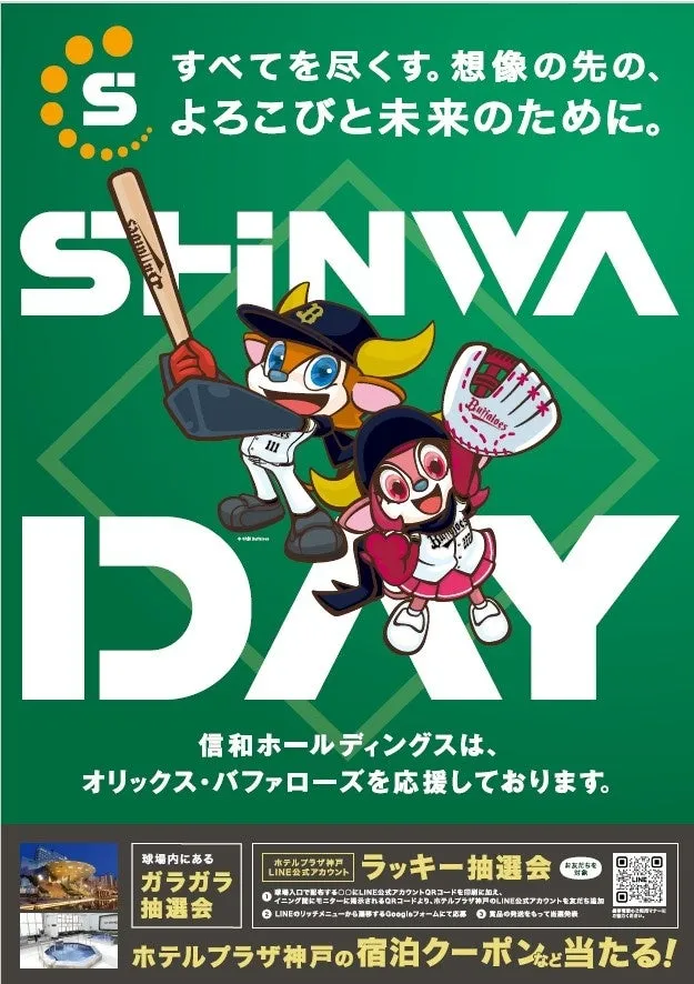「SHINWADAY」は、信和グループが冠協賛する特別な試合です。試合開始は18:00、京セラドームで行われるこの一戦では、会場全体が信和グループの広告で覆われ、来場者を迎え入れます。入場ゲートや外野の看板、さらには球場モニターに至るまで、一面に「SHINWA」の文字が掲出され、特別感を演出します。