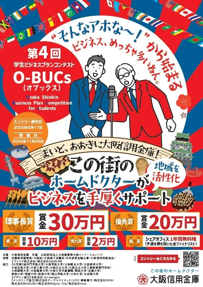 大阪信用金庫主催の「第4回学生ビジコン O-BUCs(オブックス)」の開催が決定し、ビジネスプランのプロジェクト募集がスタートしました。このコンテストは、地域社会及び経済の活性化を促進することを目的に、若い学生たちの新しいアイデアとチャレンジ精神を引き出すことを狙いとしています。