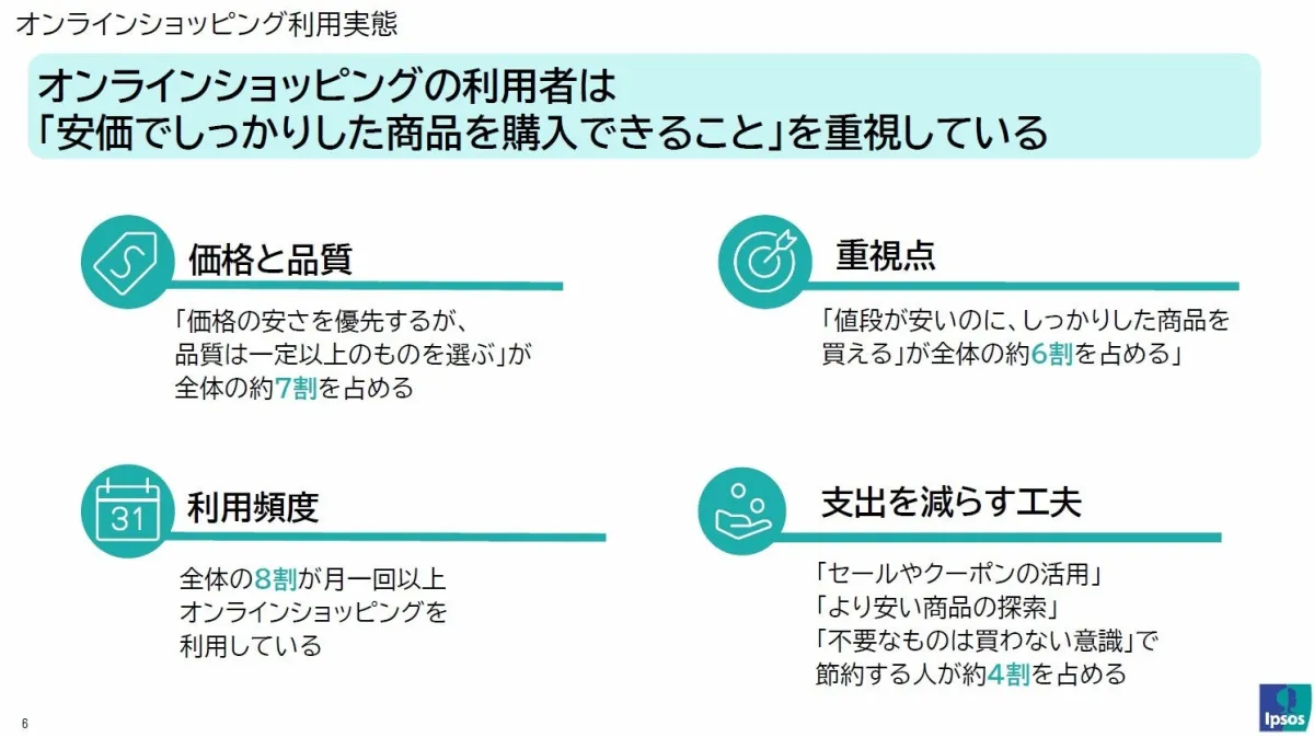イプソスの担当者によると、オンラインショッピングは今後も節約志向や利便性が高まる中で、日常的な買い物手段として定着していく見込みです。今回の調査結果からは、消費者が求めているのは価格の安さだけでなく、品質とコストパフォーマンスが重要であることが明らかです。