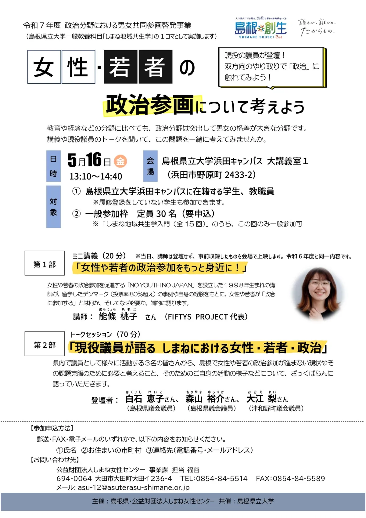 続く70分では、現役の島根県議会議員が参加するトークセッションが予定されています。登壇するのは、白石恵子さん(島根県議会議員)、森山裕介さん(島根県議会議員)、大江梨さん(津和野町議会議員)の3名です。ここでは、島根における女性や若者の政治参加の現状や課題、またそれを克服するために必要な活動について率直な意見交換が行われます。