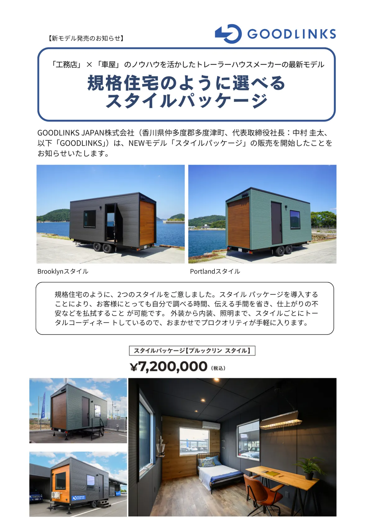 香川県に拠点を置くトレーラーハウス専門メーカー「GOODLINKS」では、住宅に新たな選択肢を提供しています。規格住宅のように選べる2つのスタイルパッケージを導入することで、ライフスタイルに合わせた住まいが手に入ります。特に注目すべきは、「工務店」と「車屋」のノウハウを融合し、トレーラーハウスの利便性と品質を追求している点です。