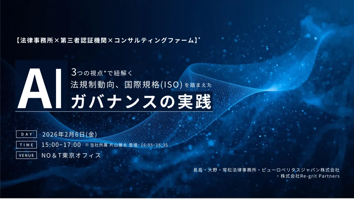 株式会社Re-grit Partnersは、長島・大野・常松法律事務所及びビューローベリタスジャパン株式会社と協力し、2026年2月6日(金)に「AIガバナンスを法規制と国際規格の視点から考える」と題したセミナーを開催します。このイベントでは、法務やITに携わる専門家が、最新の法規制や国際規格に基づいたAIガバナンスの実践について議論します。