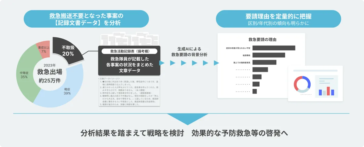 横浜市消防局は、この傾向に対処するため、急病や怪我の予防に関する啓発活動を行い、救急車の適正な利用法を広める取り組みを進めています。しかし、緊急性の低い要請の背景を詳しく分析するには、多くの非構造テキストデータを扱わなければならず、これまでの技術では難しい課題がありました。