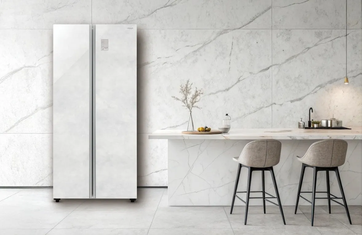 AQUAの冷蔵庫は、2017年からの販売以来「プロが使う冷蔵庫のよう」として多くの支持を得てきました。そして、「AQR-SBS48A」では、薄型で大容量ながら、仕切り棚がついていて整理整頓が容易という機能もそのままに、高級感を感じさせる大理石調のガラス扉を取り入れました。このデザインは、上質なキッチン空間を演出します。さらに、アルミフレームを組み合わせることで、素材感を引き立てています。