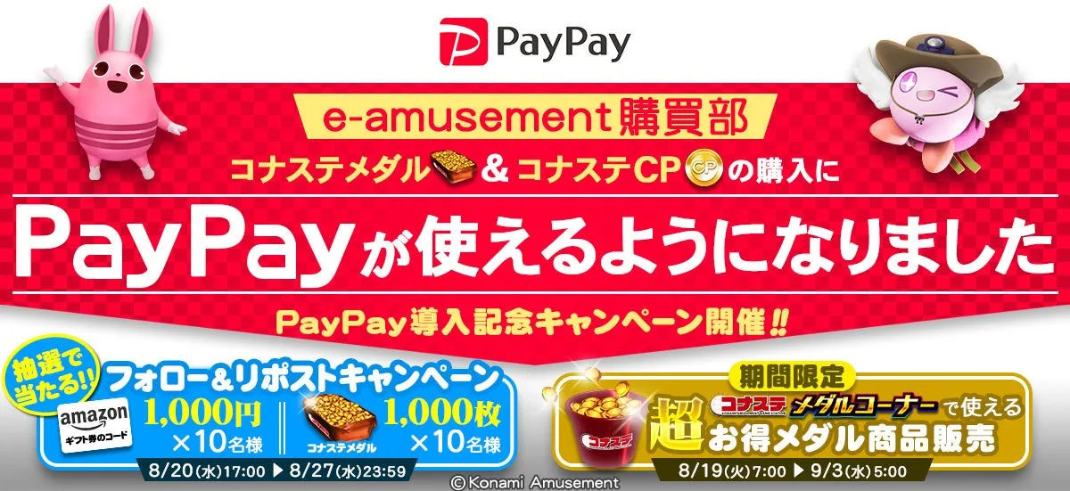 さらに、今回の「PayPay」導入を記念して、特別キャンペーンも実施されます。「PayPay導入記念 購買部お得メダル商品」が2023年8月19日から期間限定で販売される他、8月20日からは「フォロー&リポストキャンペーン」を行い、「Amazonギフトカード」や「コナステ専用メダル」が抽選でプレゼントされる特典も設けられています。