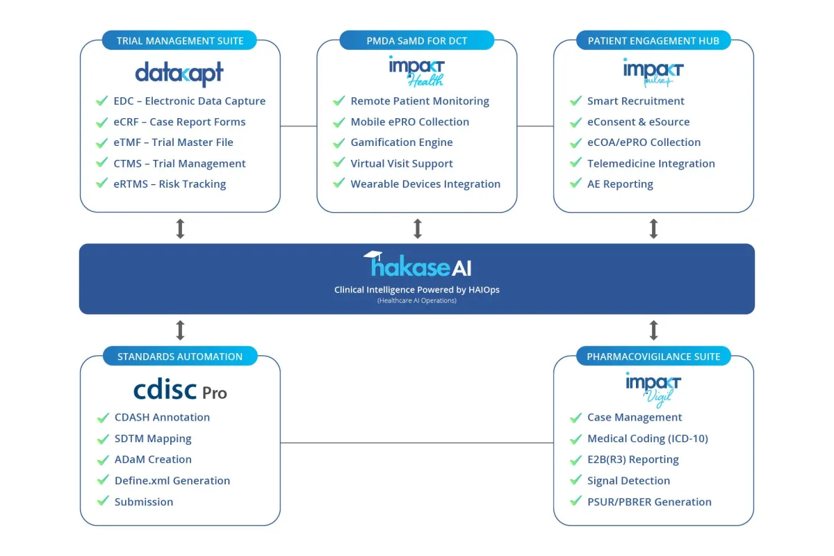 EDC(電子データ収集)、eCRF(症例報告書)、eTMF(臨床試験マスターファイル)などを統合し、AIによるリアルタイム検証やリスク予測を実現。