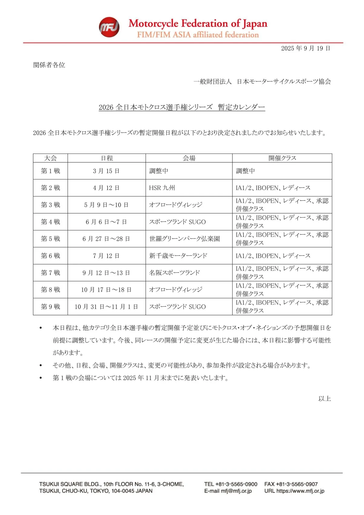 一般財団法人日本モーターサイクルスポーツ協会(MFJ)は、2026年の全日本モトクロス選手権に関する暫定カレンダーを発表しました。このカレンダーに基づいて、全9戦のレースが行われる予定です。