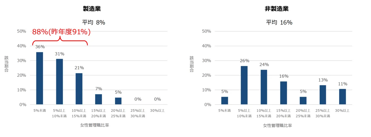 調査によると、2025年3月期の女性管理職比率は、製造業が平均8%、非製造業が平均16%でした。特に非製造業では、銀行や保険業が高い比率を示しており、逆に製造業の中では医薬品が高い一方、輸送用機器は低い数値となっています。これは製造業が依然として男性中心の業界であることを反映しています。