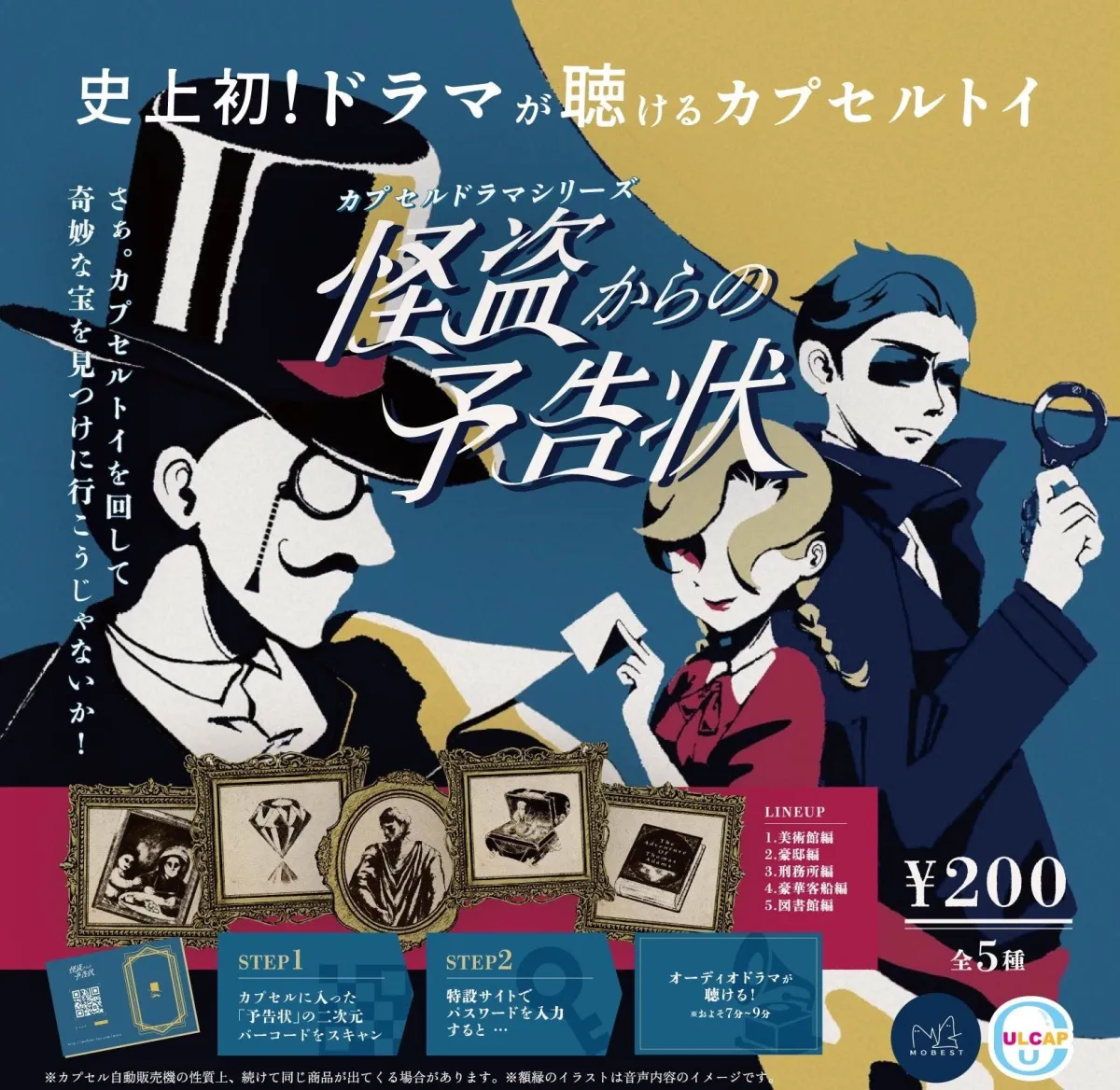 2023年9月22日、ガチャガチャの楽しさと物語の魅力が融合した『カプセルドラマシリーズ・怪盗からの予告状』が全国で発売されます。この全く新しいストーリー体験は、カプセルトイからオーディオドラマが聴けるという斬新な試みです。カプセルを開けて登場する「怪盗からの予告状」には、実際に物語の進行に使われる「二次元バーコード」と「パスワード」が記載されており、開封した瞬間から物語の世界に引き込まれます。