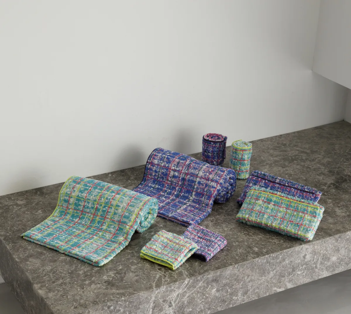 「マジョリカ」は、その名の通り、タイル模様をモチーフにした美しいタオルです。英国ヴィクトリア朝のデザインにインスパイアされ、多色ジャガードで織り上げており、奥行きのある色合いと立体的な表情が見事です。特にブルーのアクセントが効いており、クラシックな中にも現代的なセンスが漂います。また、凹凸が際立つ織りが、触ったときの心地よさをとはもちろん、視覚的な楽しみも与えてくれます。