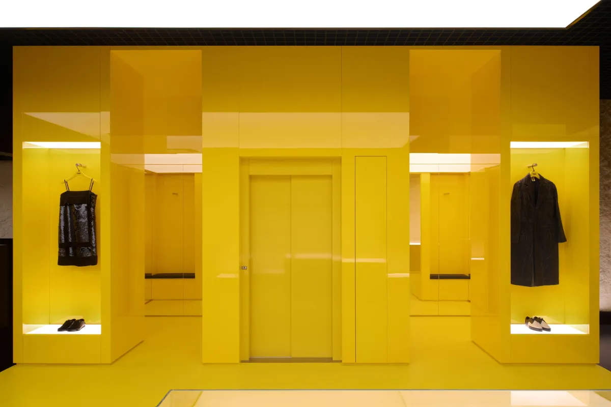 内装には、ブランドのアイコニックな商品が美しくディスプレイされ、イエローと濃いトーンのコントラストが高級感を演出しています。また、ミニマルな什器が置かれ、視認性も抜群です。
