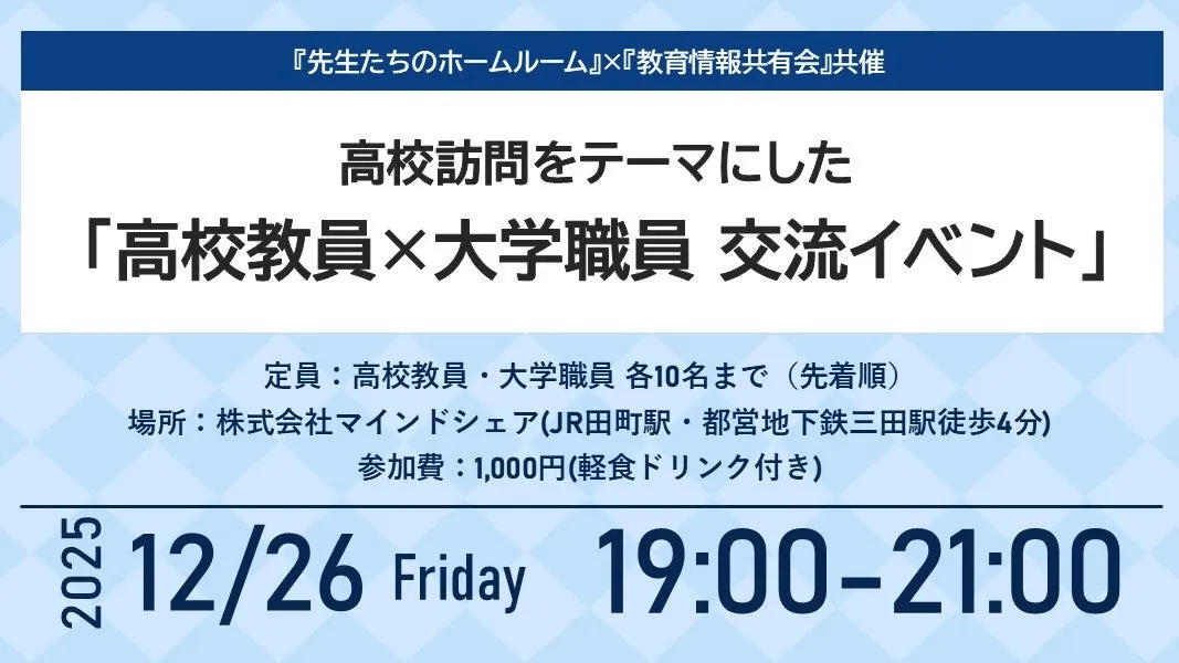 株式会社マインドシェアが主催するディスカッション型交流イベントが、2025年12月26日(金)に東京で開催されます。このイベントは、教育機関の取り組みを共有し、高校教員と大学職員がより良い関係を築くことを目的としています。