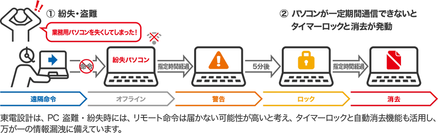 その機能は、ネットワーク接続を気にせず、盗難や紛失時に情報を安全に保護するものです。具体的には、遠隔命令やタイマー機能を活用することにより、どんな環境でもデータ消去が可能です。さらに、不正利用の防止機能も搭載しており、利用ルールに従わない行動があった場合には自動的にセキュリティアクションが発動します。