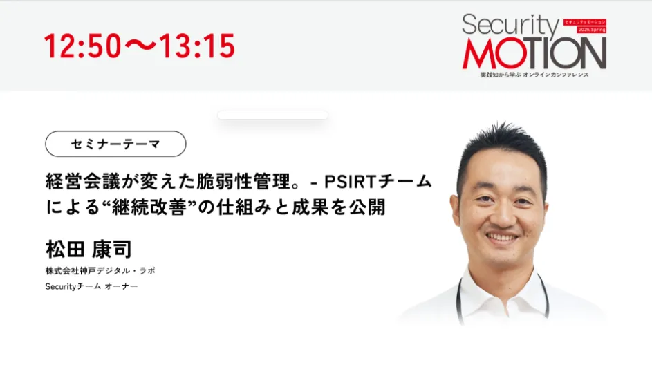 現在、企業が直面するセキュリティ課題に対しては、経営層の参与が不可欠です。オンラインカンファレンス「Security MOTION 2026 Spring」では、現実の取り組み事例を通して、いかにして脆弱性管理が企業の経営課題として認識され、対策が講じられたのかが示されます。特に、KDLのPSIRTの取り組みは、多くの企業にとって参考となるでしょう。ぜひ参加して、最新の情報セキュリティの実践を学んでください。