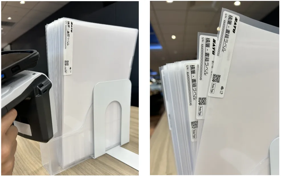 開発されたRFIDタグは、厚さ0.2mmのクリアファイル100枚を重ねた状態でも、ハンディリーダーを用いてスムーズに読み取ることができる。この技術は、特にオフィスでの書類整理やファイリング作業において、極めて効率的な成果をもたらす。さらに、定置式リーダーにおいてもクリアファイル50枚を重ねた状態で全てを一括読み取りする性能を誇るため、様々なシーンで利用できる。