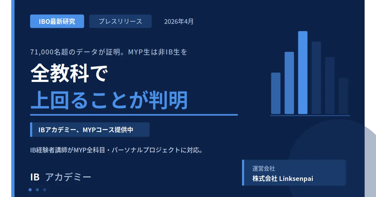 東京都渋谷区に拠点を置く株式会社Linksenpaiが運営する『IBアカデミー』は、オンライン家庭教師サービスとして国際バカロレア(IB)教育に特化しています。今年度の新たな調査結果が展示され、特にMYP(Middle Years Programme)コースに注目が集まっています。これは、国際バカロレア機構(IBO)が2026年2月に発表した独立研究の成果です。