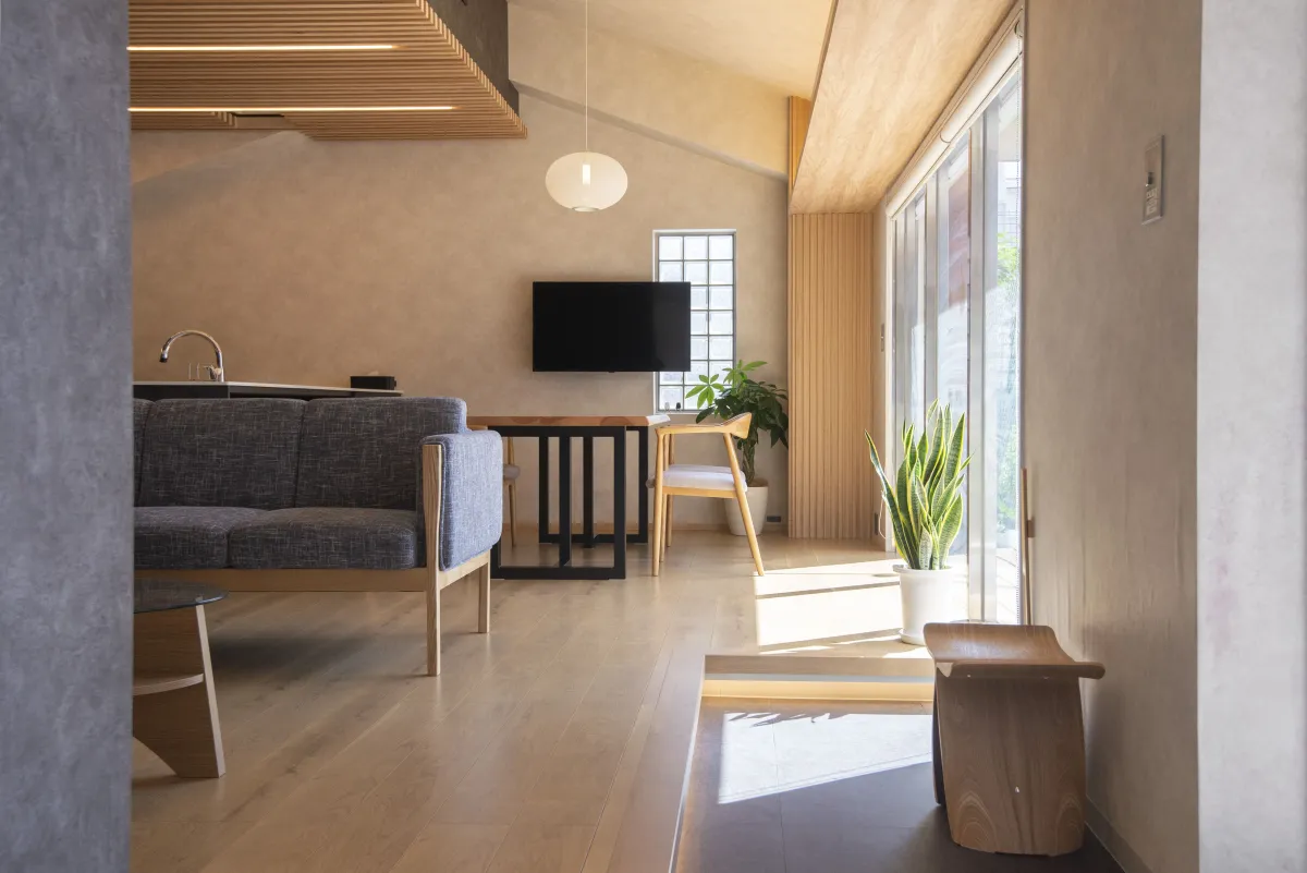 イベント会場となるのは、JR郡山駅前に位置する新しいヨシケンホームのショールームです。このショールームは、旅館のような「ジャパンディー」スタイルでデザインされており、癒しと洗練された空間が特徴です。さらに、家具のセット販売を行い、耐震補強後も美しい暮らしを実現するための提案をしています。間接照明を施した高級感のある空間で、来場者が落ち着いて情報収集できるよう配慮されています。