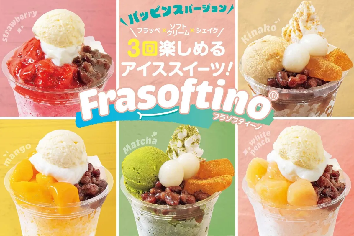 フラソフティーノは、上がフラッペ、下がソフトクリームという二層構造になっており、まずはフラッペを楽しみ、その後にソフトクリームを味わいます。そして、最後に二つの層を混ぜ合わせてシェイクしながら食べることで、さらに新しい味わいを発見することができます。この楽しい食べ方から「美味(おい)ティーノ!」と歓声を上げたくなることでしょう。