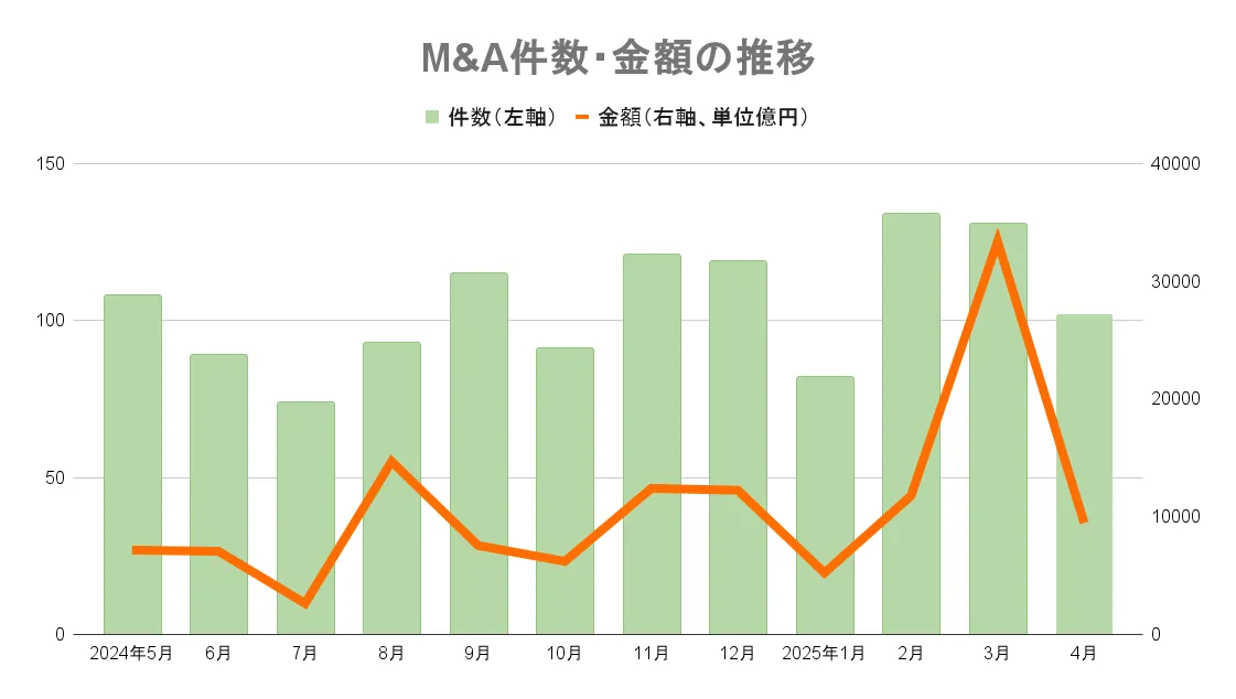 2025年4月、日本のM&A市場は過去最高の102件に達し、前年同月比で7件の増加を記録しました。この件数は、2008年に集計が始まって以来、初めて100件を超えるものであり、特筆すべき進展を示しています。これに伴い、取引総額は9467億円に達し、前年同月比で38.6%の増加を遂げました。