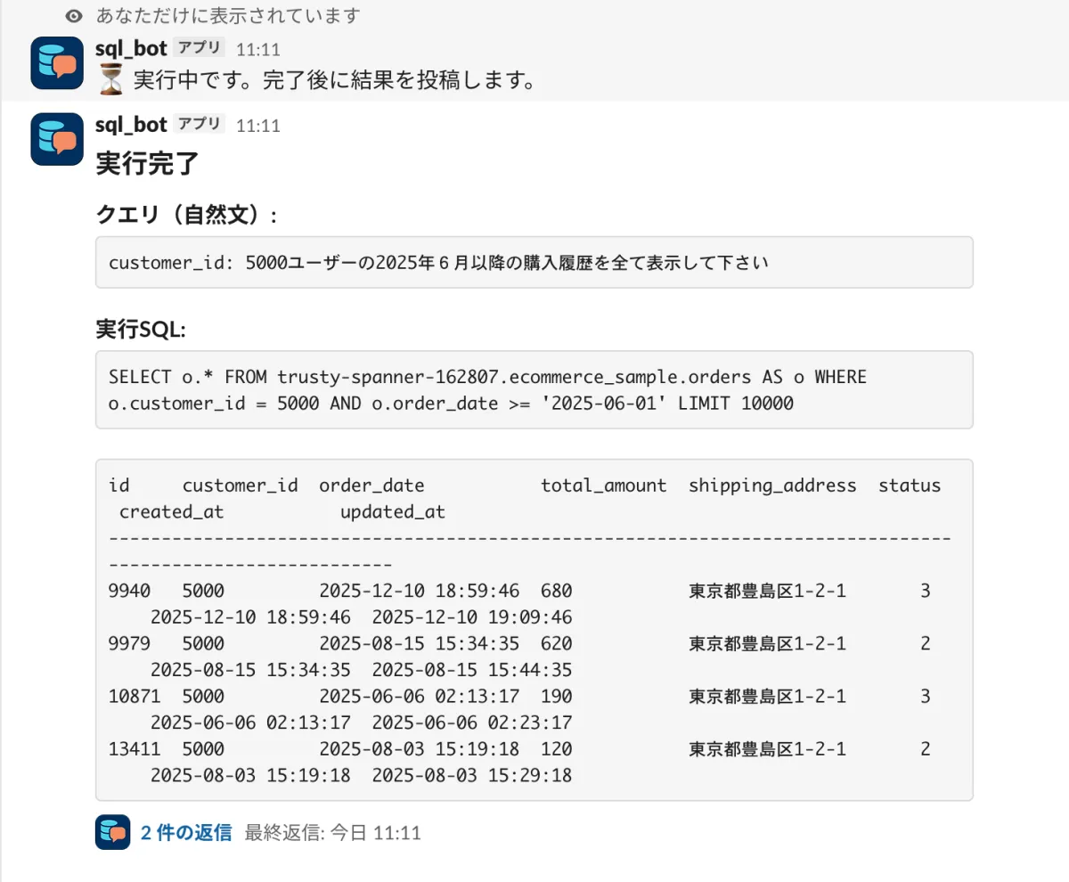 例えば、ユーザーが「5000ユーザーの2025年6月以降の購入履歴を全て表示して下さい」という自然文をSlackで送信すると、その背後で適切なSQL文が生成され、BigQueryを通じてデータが取得されます。この過程は全自動化されており、導入にあたる手間も最小限に抑えられています。