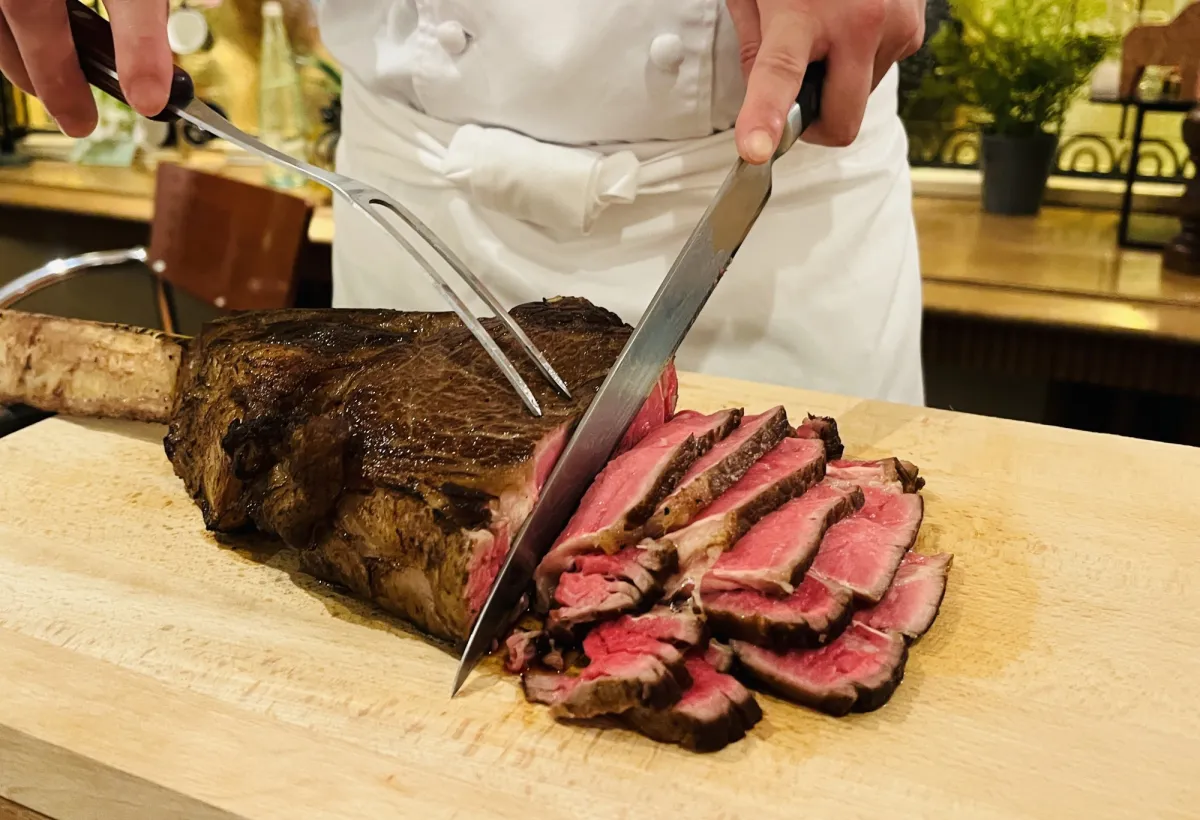 ビュッフェの目玉は、なんといっても薪窯ビーフステーキのカービングサービス。シェフが目の前で豪快なトマホークステーキを切り分けてくれるこの体験は、肉汁があふれ出す贅沢なひと時です。特製のソースとの相性も抜群で、香ばしい風味とともに深い旨みを堪能できることでしょう。