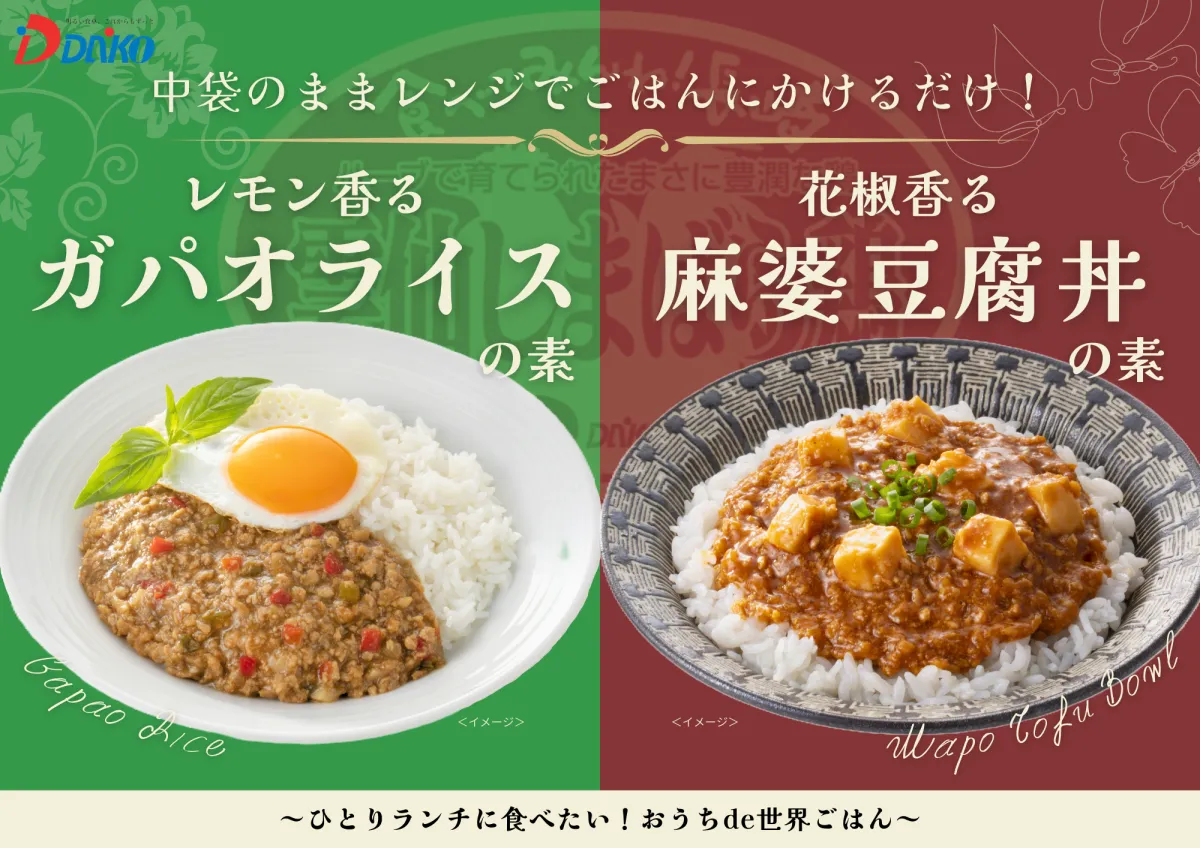 「おうちde世界ごはん」シリーズの中には、電子レンジで手軽に調理できる「レモン香るガパオライスの素」と「花椒香る麻婆豆腐丼の素」の2品があります。それぞれの商品の特徴には、タイの代表的な料理と中国の人気メニューがあしらわれており、忙しい日常の中で美味しいご飯を手軽に作ることができるよう工夫されています。