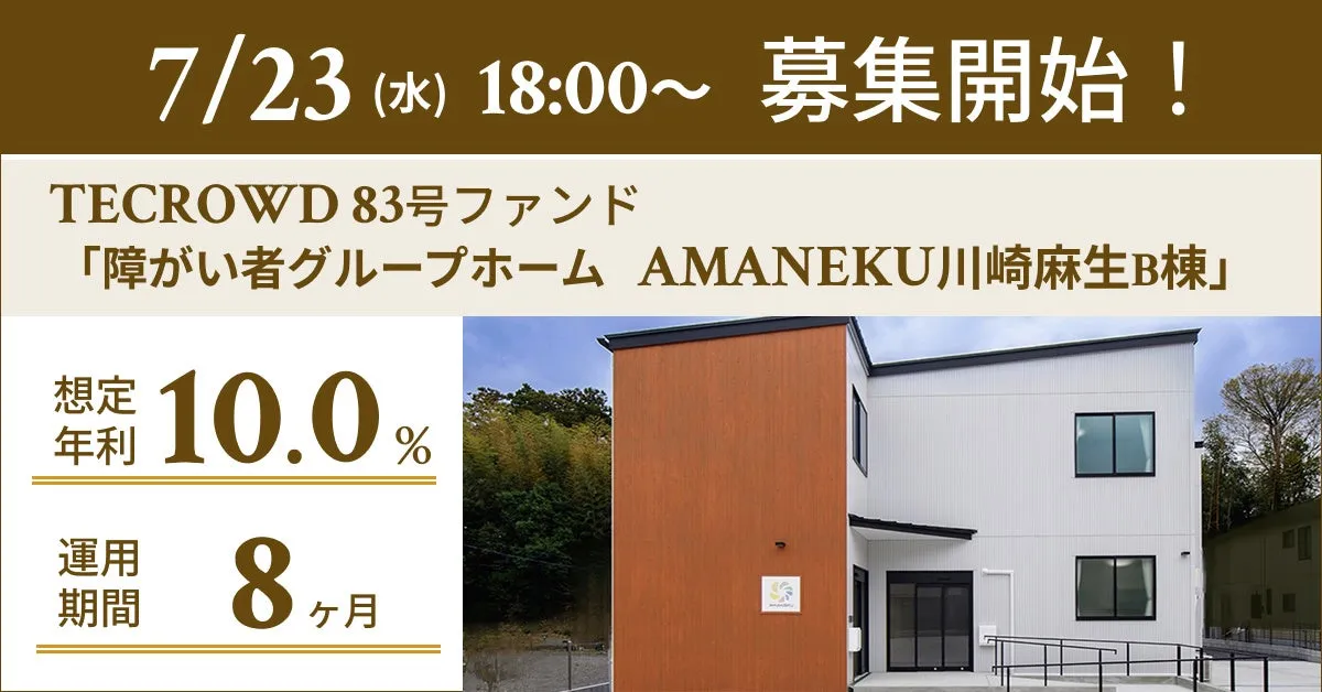 2025年7月23日(水)、不動産クラウドファンディングサービス「TECROWD」を運営するTECRA株式会社は、新ファンド「障がい者グループホームAMANEKU川崎麻生B棟」の募集を開始します。このファンドは、障がい者グループホームという社会貢献型のプロジェクトへの投資機会を提供します。