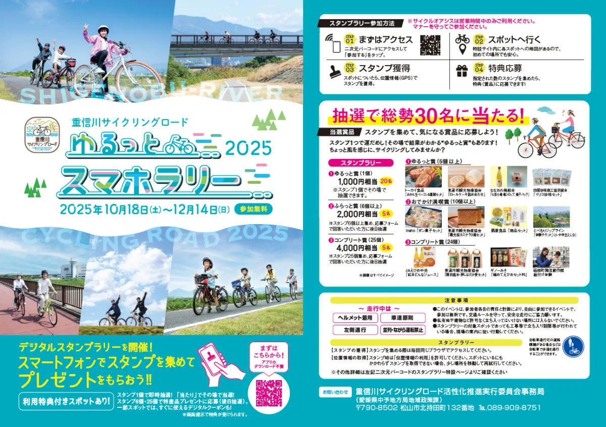 「重信川サイクリングロード デジタルスタンプラリー2025」は、全25カ所のスポットが予定されており、期間中は誰でも参加可能。参加費は無料で、スマートフォンで特設サイトにアクセスすることで、地図に沿って各スポットへと進むことができます。スタンプの獲得は、指定の位置に到着した際に行われ、集めたスタンプ数に応じて特典が受けられます。これにより、温泉とサイクリングが融合した新しい地域体験が提供されるのです。