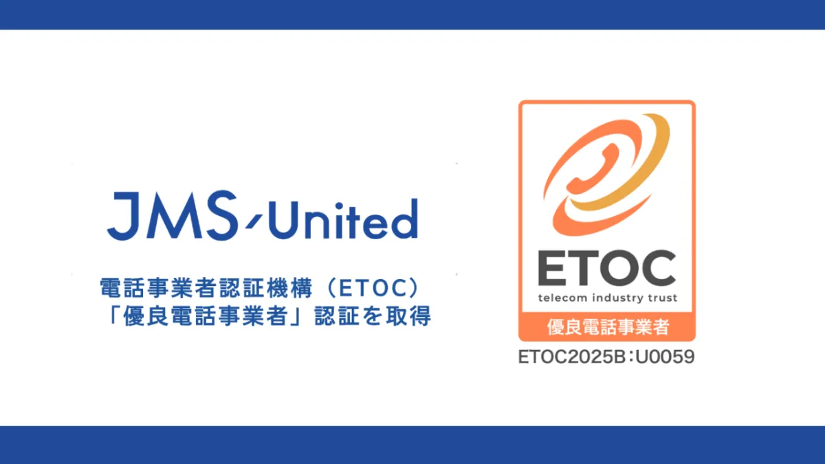 2025年6月1日、ジェイエムエス・ユナイテッド株式会社が電話事業者認証機構(ETOC)から優良電話事業者としての認証を受けました。これは、同社が提供する音声コミュニケーションサービスの質の高さと、その信頼性を証明するものです。これまでの取り組みが第三者機関によって評価されたことは、顧客や取引先にとっても大きな安心材料となるでしょう。