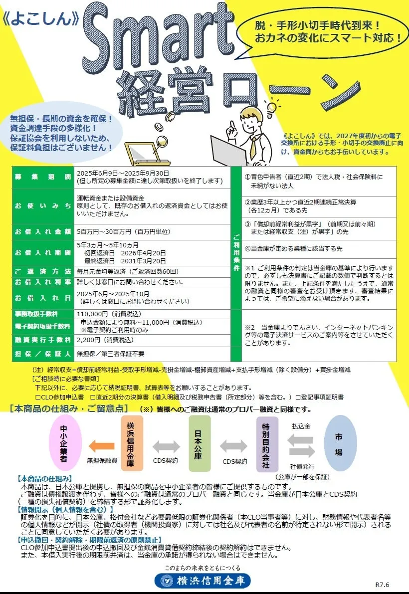 「《よこしん》Smart経営ローン」は、令和7年6月9日から令和7年9月30日まで提供されます。ただし、所定の募集金額に達し次第、取り扱いを終了するため、利用を検討している方はお早さんに申し込みをすることをおすすめします。