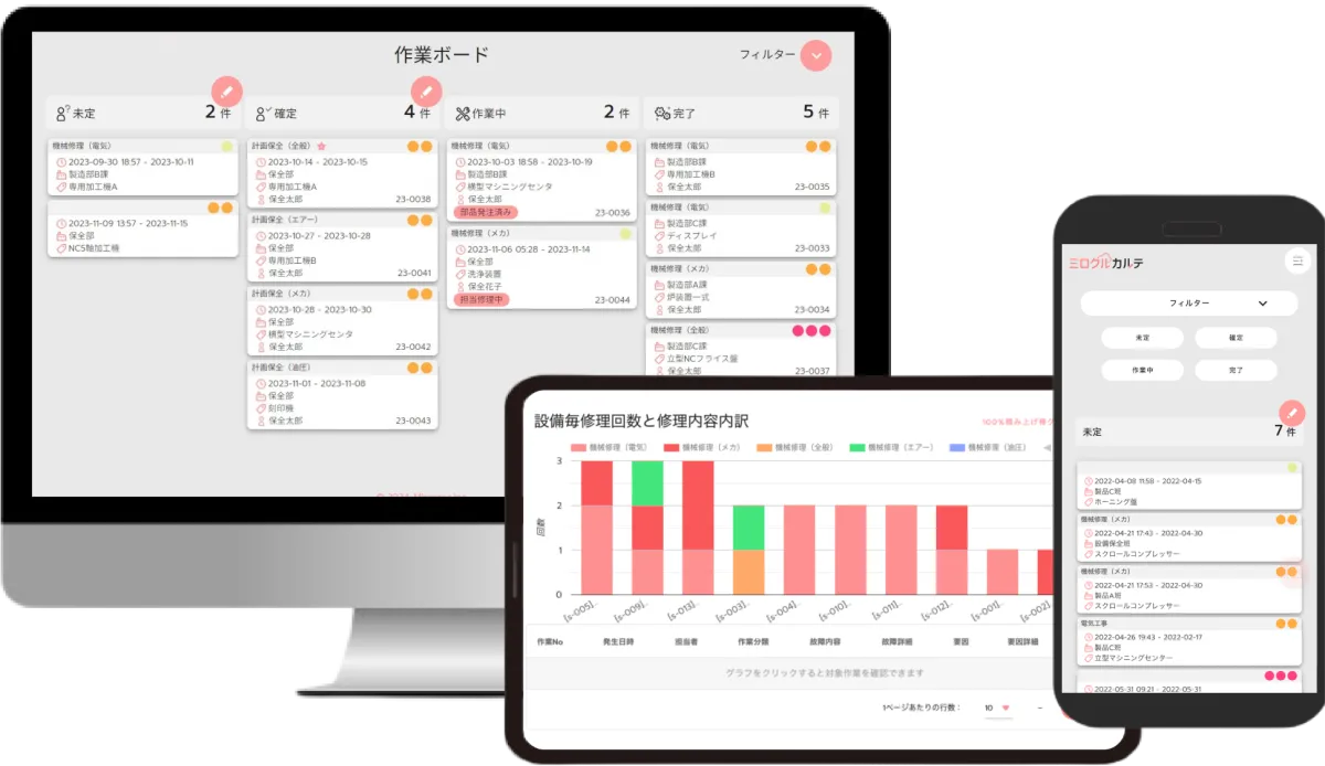 「ミロクルカルテ」を導入したことで、多摩冶金では修理タスク漏れが大幅に削減されました。このシステムの特長である作業ボードを利用して、修理状況がリアルタイムで可視化されることで、進捗の確認が簡単になっています。これにより、チーム内でのコミュニケーションもスムーズになり、無駄なコストも削減されています。