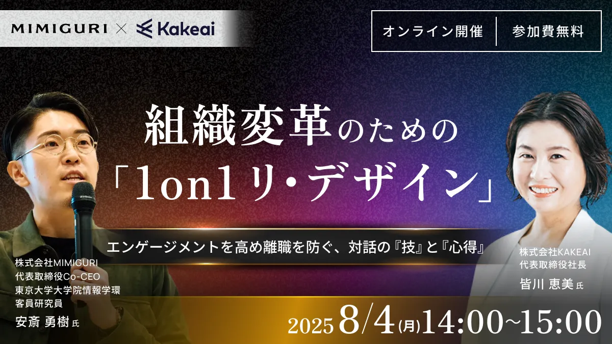 株式会社KAKEAIは、2025年8月4日(月)に人事・管理職向けのオンラインセミナー「組織変革のための1on1 リ・デザイン」を開催します。このセミナーでは、エンゲージメント向上や離職率低減、イノベーションを促進するための対話の重要性を中心に解説されます。