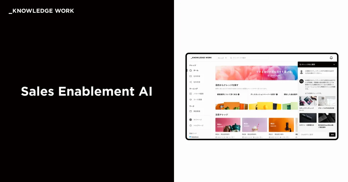 ワーク商談推進: Salesforceから得られる顧客データをもとに、適切なナレッジを提案し商談を前進させることを手助けします。