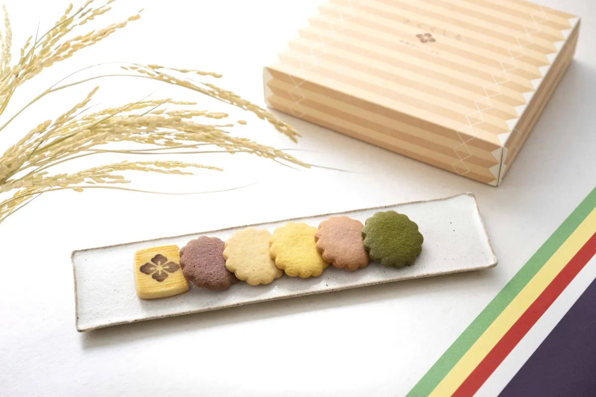 このクッキーギフトは、伊勢神宮にゆかりのある希少米「イセヒカリ」を使用した米粉を使っています。これにより、香ばしく軽やかな食感が実現されています。また、六種のフレーバーのうち、五種は伊勢神宮に捧げられる五色(青・赤・黄・白・紫)を巧みに表現しています。フレーバーは、抹茶、苺、柚子、酒、紅芋で、いずれも神聖で荘厳な美しさを演出しています。