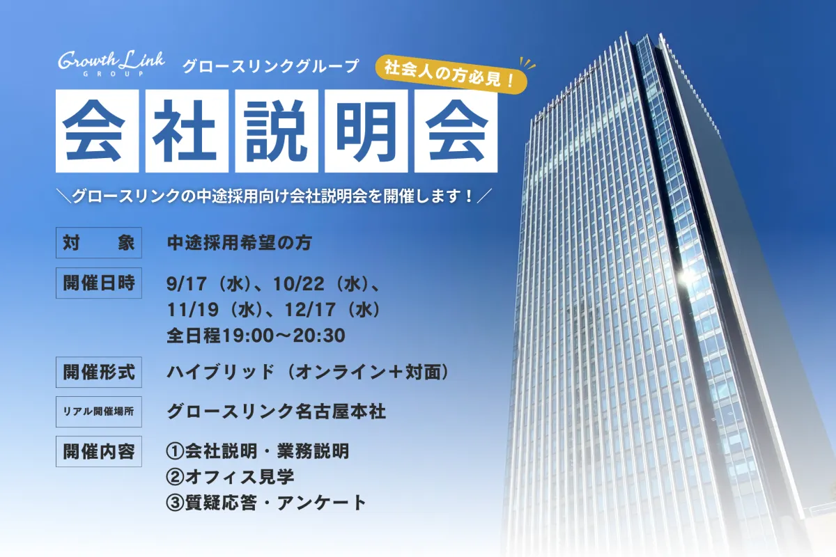 愛知県名古屋市のグロースリンク税理士法人が、この秋から冬にかけて、中途採用向けの会社説明会を開催します。本説明会は、対面とオンラインのハイブリッド形式で実施されるため、参加しやすい環境が整っています。
