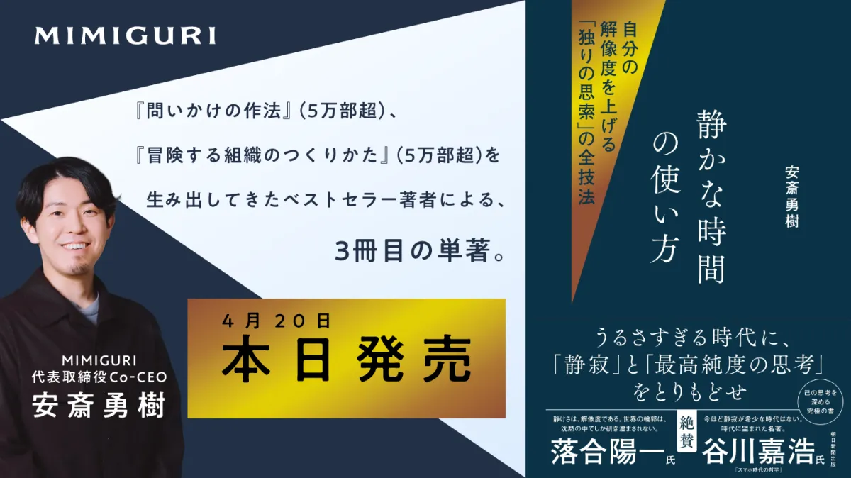 2026年4月20日、株式会社MIMIGURIの代表取締役Co-CEOである安斎勇樹氏の新著『静かな時間の使い方──自分の解像度を上げる「独りの思索」の全技法』がリリースされました。この本は複雑化し、情報過多な現代社会で自分自身を見失っているビジネスパーソンに向けた、独自の内面的成長を促すための手法が解説されています。