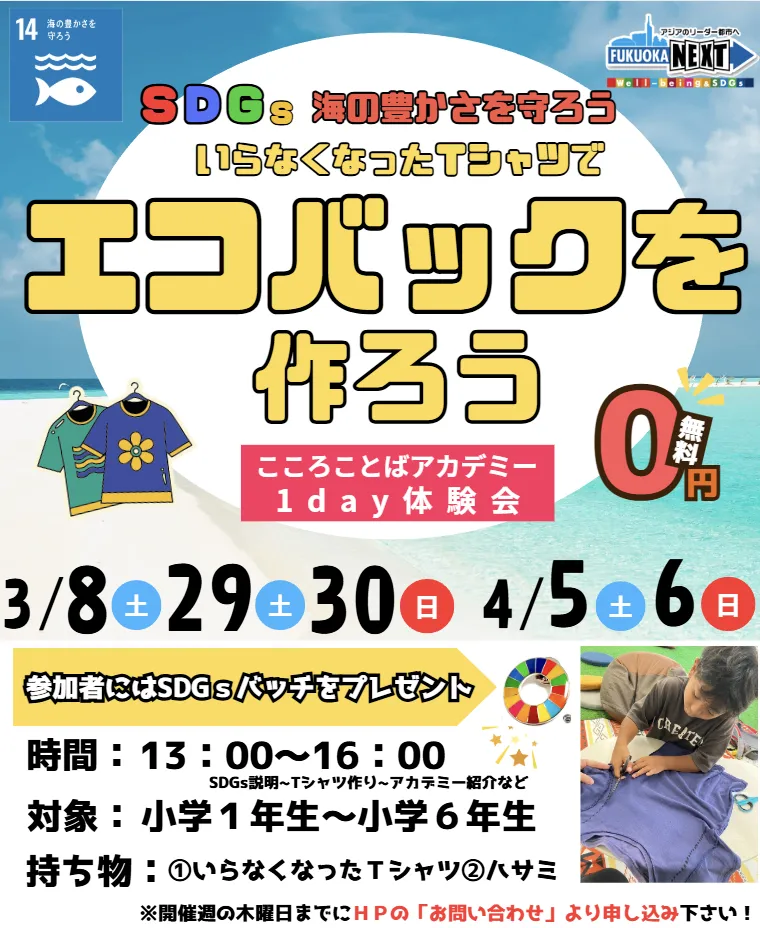 2025年3月から開催される「海の豊かさを守ろう」をテーマにした1Day体験会に注目が集まっています。主催は、福岡市に本社を置く株式会社こころことばアカデミー。このプログラムでは、参加者がいらなくなったTシャツを利用して、自分だけのオリジナルエコバッグを作成することができます。これは、プラスチックごみによって海洋生物が危険にさらされている現状を知り、実際の行動に移すための有意義な取り組みです。