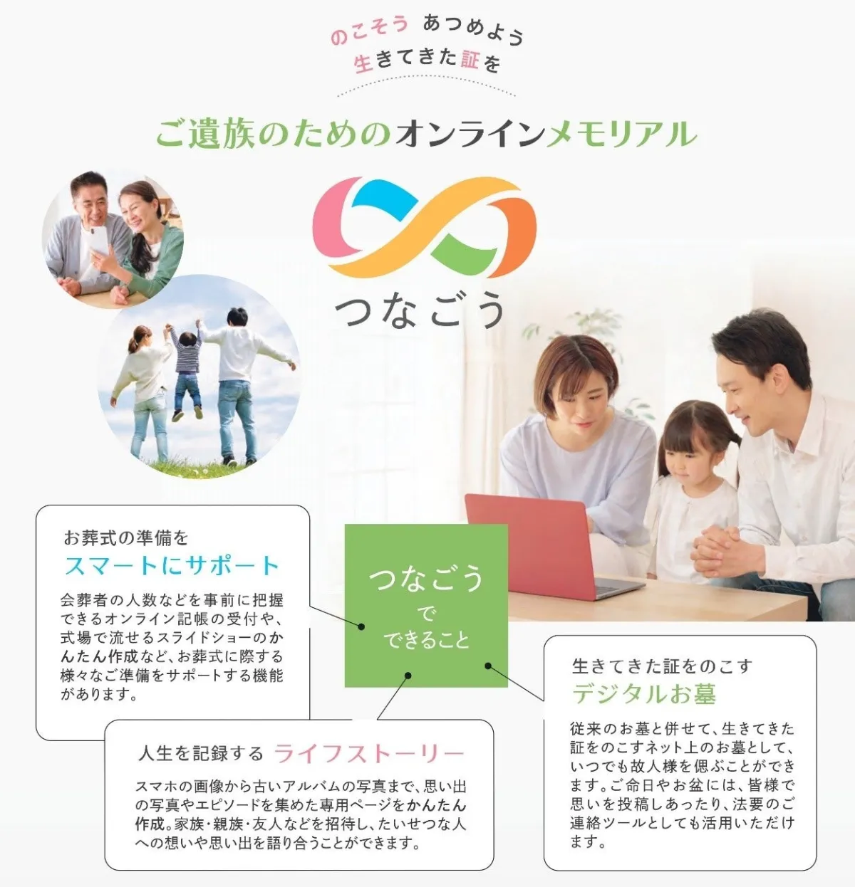 『つなごう』の特徴は、故人が生前に自らページを作成し、思い出や感謝の気持ちを記録することができる点です。また、遺志を家族に共有し、家系の歴史を記録することも可能です。プライバシーに配慮した招待制により、公開範囲を自由に設定することができます。