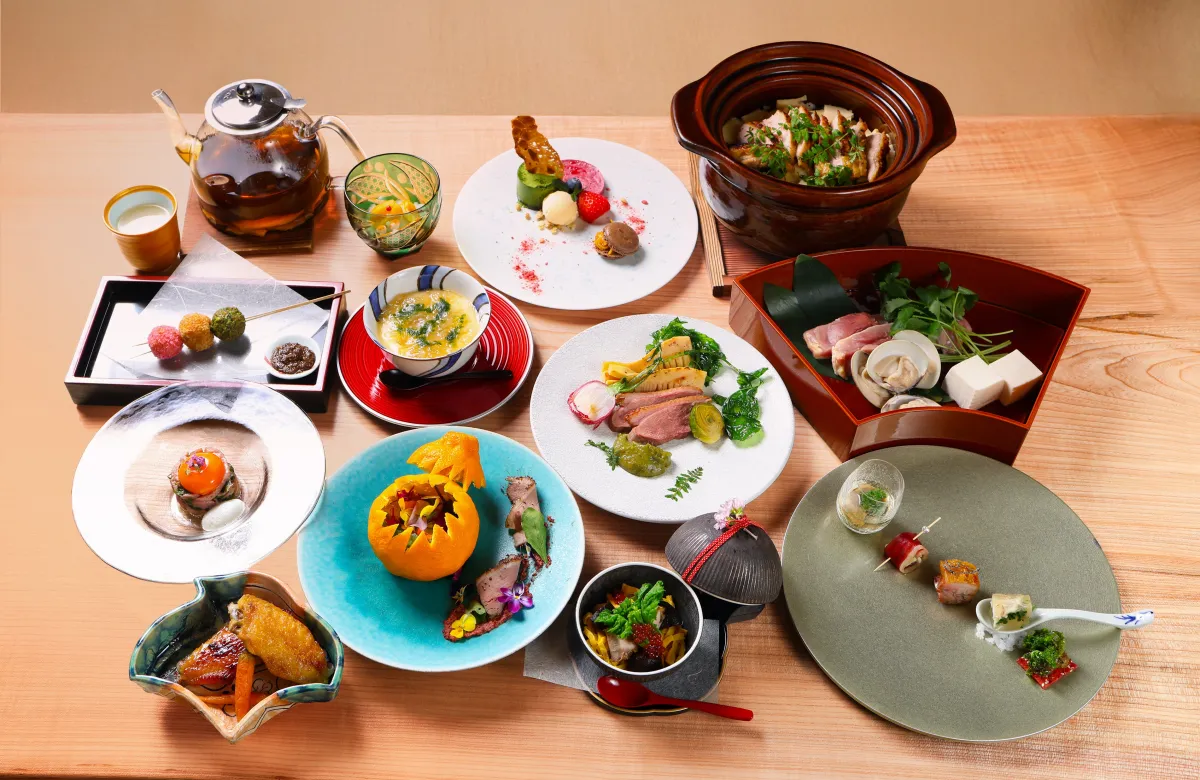 また、『九折御膳』は5,500円(税込)で提供され、9つの仕切りには京赤地鶏と京鴨を中心に春野菜や山菜が彩り豊かに盛り付けられています。この御膳では、山菜の和え物や筍の炊き物など、さまざまな春の味覚を少しづつ楽しむことができ、上品で優しい味付けが素材の風味を引き立ててくれます。親しい友人との食事や家族での団らんにぴったりのメニューです。