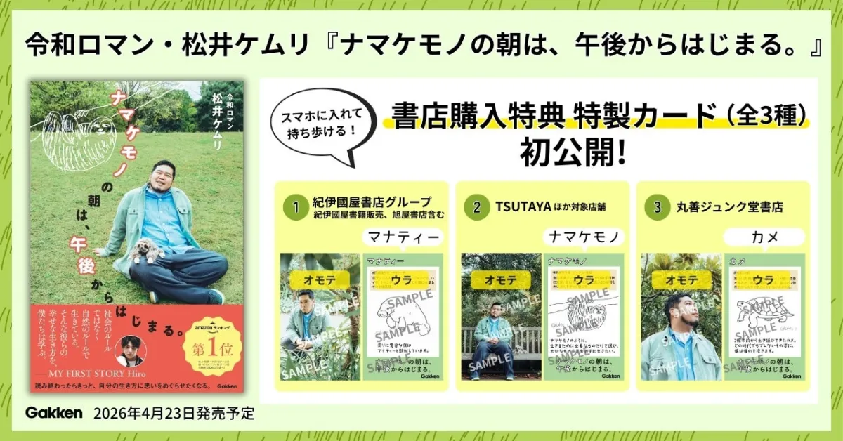 2026年4月23日に発売予定の書籍『ナマケモノの朝は、午後からはじまる。』は、お笑いコンビ「令和ロマン」の松井ケムリによる初の単著です。この本は、彼自身の深い動物愛とユーモアを織り交ぜ、さまざまな動物たちの生き様を紹介しています。松井さんは動物園に自らアポをとって飼育員体験をする程の「動物好き」であり、その情熱と思いが詰まった内容になります。