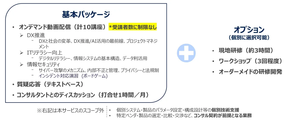 この新サービスは、年額300万円(税別)という価格設定で提供され、受講者数に制限がないため、企業全体でのトレーニングに適しています。さらに、上記に加えて現地研修やワークショップのオプションも用意されており、企業ごとの特性に応じたカスタマイズも可能です。