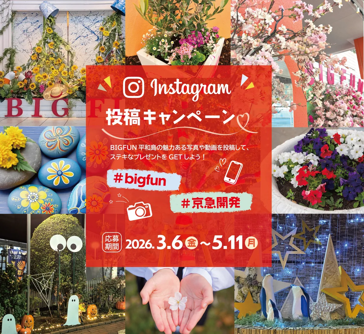また、春の装飾に合わせて公式Instagramにて投稿キャンペーンも開催されます。期間は2026年3月6日から5月11日まで。花に囲まれた瞬間をシェアしながら、素敵な商品が当たるチャンスがあります。参加方法は、BIGFUN平和島のアカウントをフォローし、指定されたハッシュタグを付けて投稿するだけで簡単です。