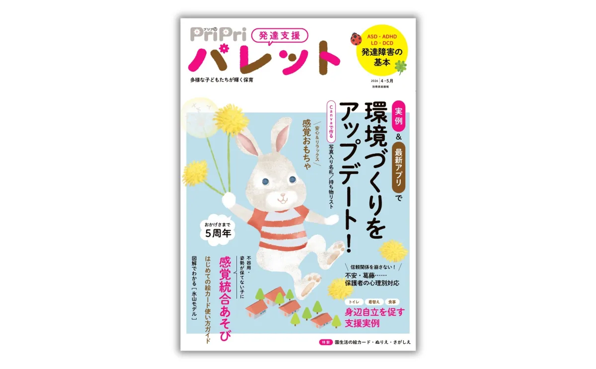 『PriPriパレット』は、発達支援に特化した専門誌。障害理解、視覚支援、保護者への支援など、幅広いテーマを扱っています。毎号、実践的な情報を視覚的にもわかりやすく提供し、保育現場や児童発達支援に携わる多くの方に支持されています。特別付録として、支援ツールや遊び教材が付いてくるのも嬉しいポイントです。