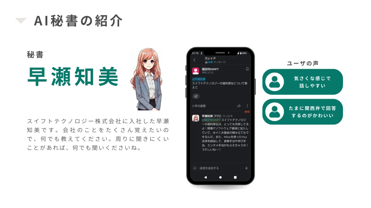 企業の業務効率化を目指す実証実験として、スイフトテクノロジー株式会社はSlack上に構築したAI秘書「早瀬知美」を運営しています。このAI秘書は、社内のナレッジを蓄積し、リアルタイムで社員の問いかけに応じて答えを提供するという新しい試みです。