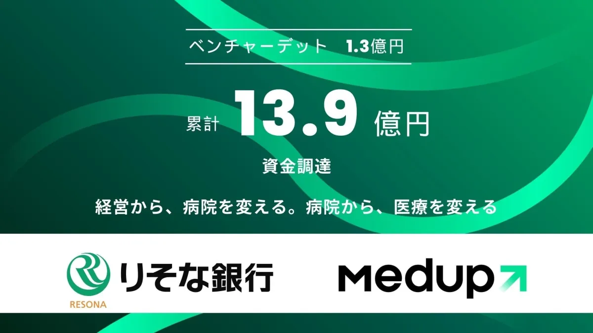 病院経営の改善を目的とするメダップ株式会社(本社:東京都港区、代表取締役:柳内健)は、株式会社りそな銀行から1.3億円の資金調達を実施した。