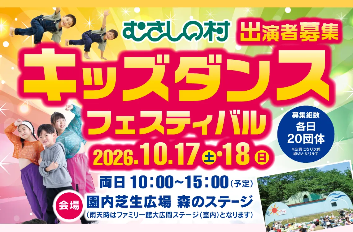 埼玉県加須市に位置するファミリーランドむさしの村で、2026年10月17日(土)と18日(日)に「キッズダンスフェスティバル」が開催されます。このイベントは、子どもたちがヒップホップ、K-POP、チアダンス、フラダンス、よさこいなどさまざまなスタイルのダンスを披露できる場です。参加するお子さまには、当日利用できる乗物フリーパスがプレゼントされる特典も用意されています。