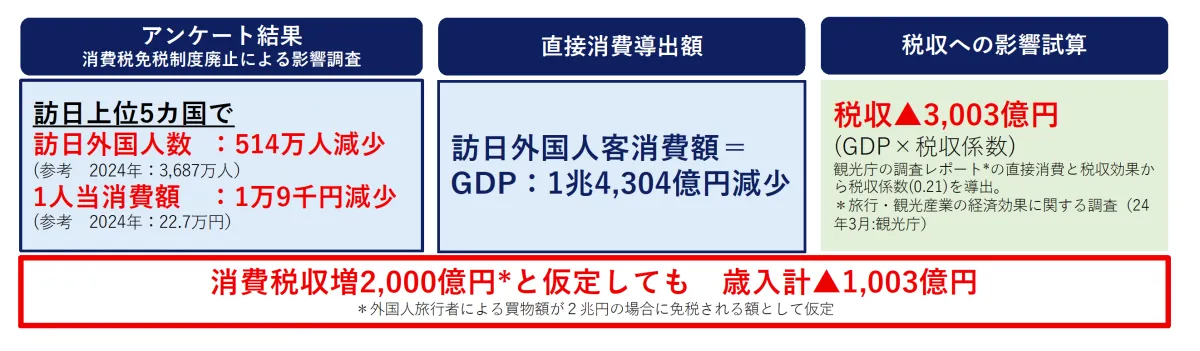 一部の意見では、オーバーツーリズム対策のために免税制度を廃止すべきだとされていますが、今回の調査結果はその意見に反対するものです。たとえ制度廃止によって消費税収が2,000億円増加したとしても、結果として歳入全体は1,003億円の減少となる見込みです。