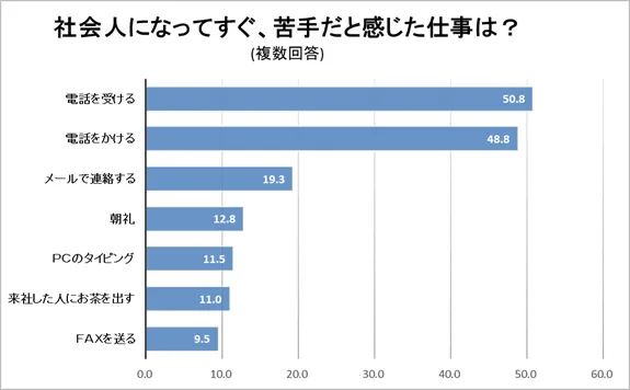 調査の結果、『電話を受ける』や『電話をかける』といった業務がそれぞれ50.8%と48.8%の回答率を示し、実に約5割の若手が電話業務に対して強い苦手意識を感じていることが明らかになりました。また、電話に次いで高い苦手意識が見られたのが『メールでの連絡』で、19.3%が該当しています。自由記述の回答からは、若手社員が教育の必要性を強く感じていることも分かりました。